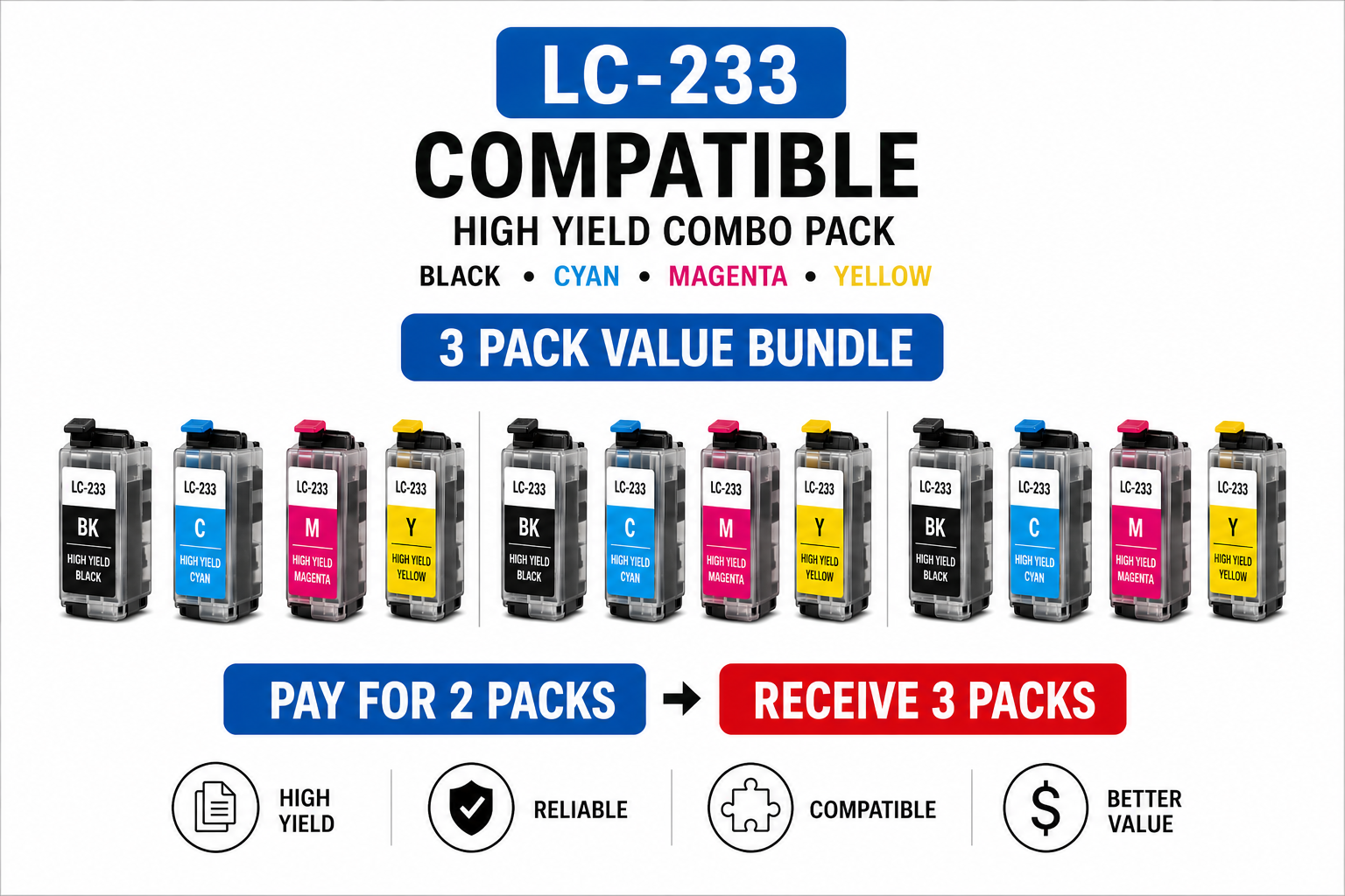 Brother LC-233 Compatible High Yield Combo Pack – 3 Pack Value Bundle