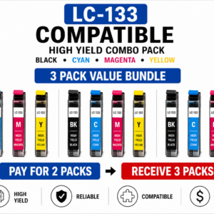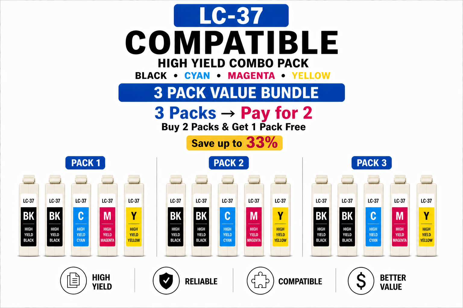 The Brother LC-37 Compatible High Yield Combo Pack – 3 Pack Value Bundle includes three complete compatible combo packs, each containing 2 × Black and 1 × Cyan, Magenta and Yellow cartridges. This value-focused bundle is ideal for users who print regularly and want better long-term savings with fewer cartridge replacements.