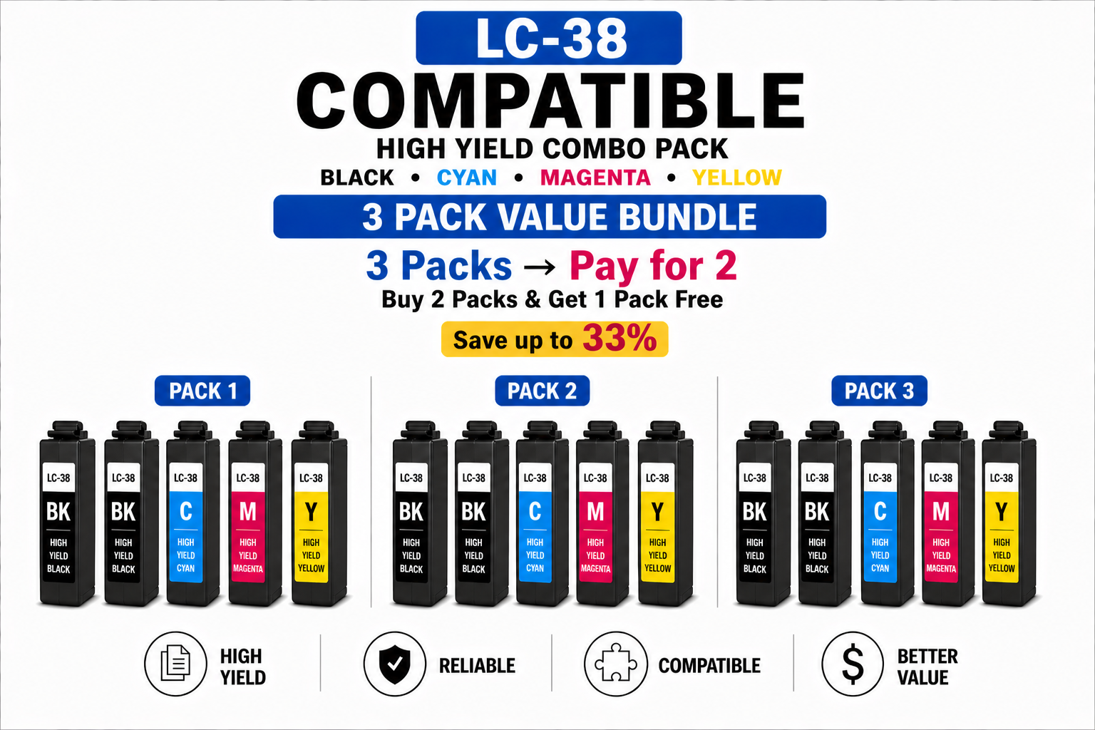 The Brother LC-38 Compatible High Yield Combo Pack – 3 Pack Value Bundle includes three complete compatible combo packs, each containing 2 × Black and 1 × Cyan, Magenta and Yellow cartridges. This value-focused bundle is ideal for users who print regularly and want better long-term savings with fewer cartridge replacements.