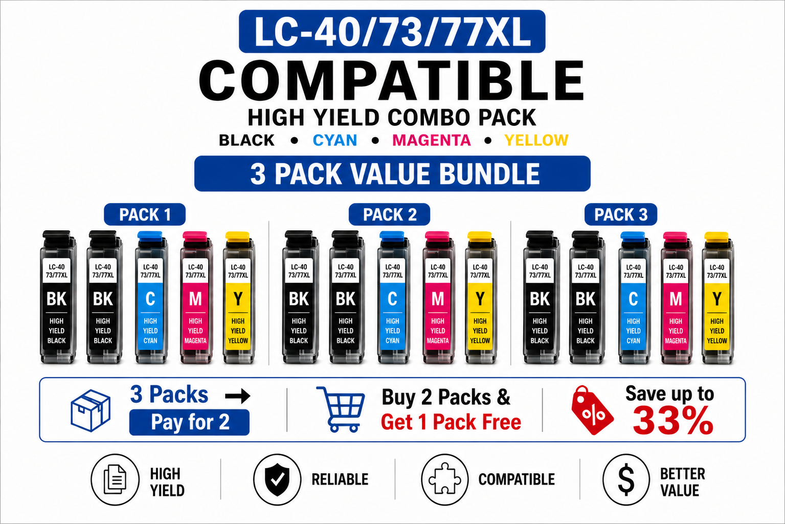The Brother LC-40/73/77XL Compatible High Yield Combo Pack – 3 Pack Value Bundle includes three complete compatible combo packs, each containing 2 × Black and 1 × Cyan, Magenta and Yellow cartridges. This bundle is ideal for users who print regularly, especially with higher black usage, and want better long-term value with fewer reorders.